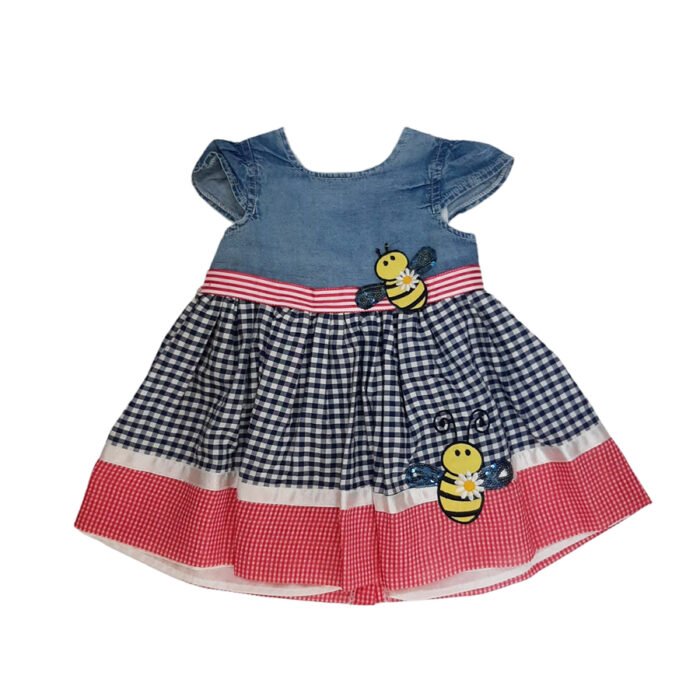 Ova preslatka haljinica sa pčelicama savršena je kombinacija udobnosti, kvaliteta i razigranog dizajna. Gornji deo haljinice izrađen je od mekanog denim materijala, dok donji deo krasi klasični tamnoplavi karirani dezen sa crveno-belim detaljima. Na haljinici se nalaze simpatične aplikacije pčelica koje dodaju potpuno poseban, vedar izgled.