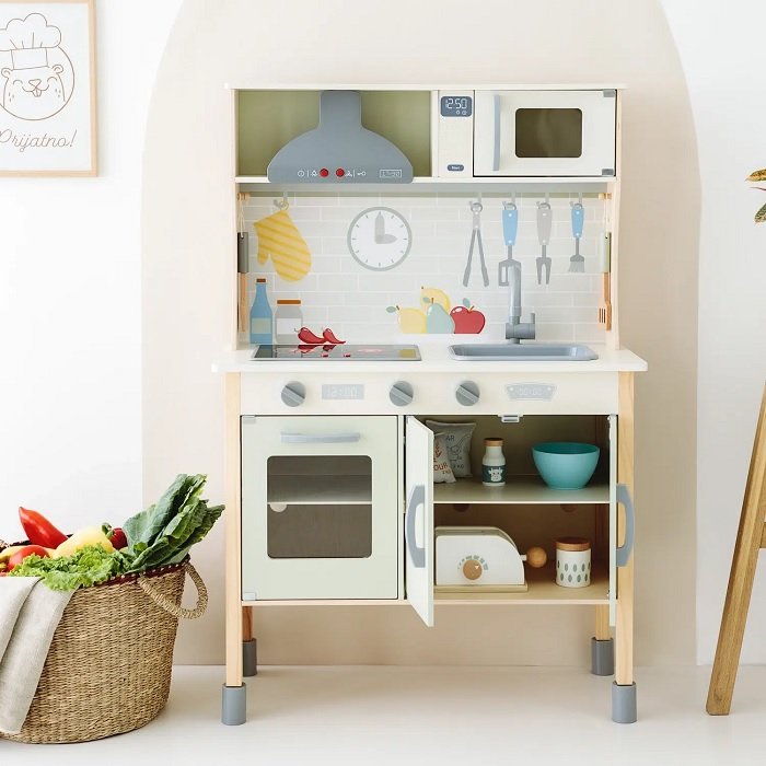Pino drvena kuhinja za decu – mini kuhinja sa autentičnim zvucima i pratećim priborom.