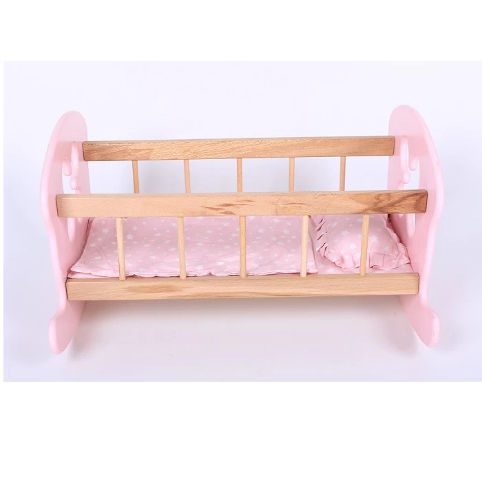 Drvena kolevka za lutku sa jastučetom i pokrivačem.
