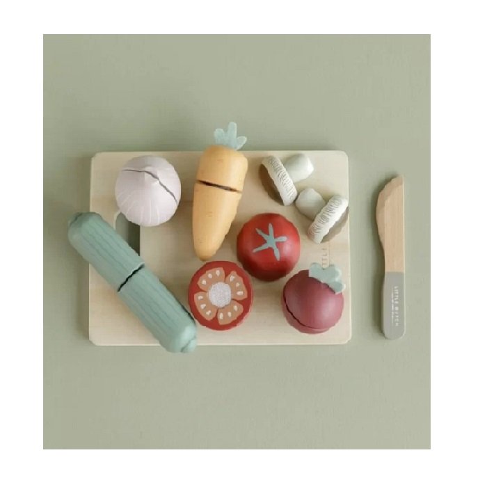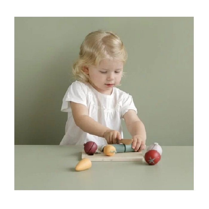 Sastavni deo seta je daska za rezanje i drveni nož koji omogućavaju deci da vežbaju veštine rezanja i istraže unutrašnjost povrća. Plodovi se lako mogu ponovo spojiti pomoću čička, što dodatno podstiče razvoj koordinacije i spretnosti. Preporučen uzrast za ovaj set je 2+ godine, prilagođen tako da bude bezbedan i uzbudljiv za najmlađe.