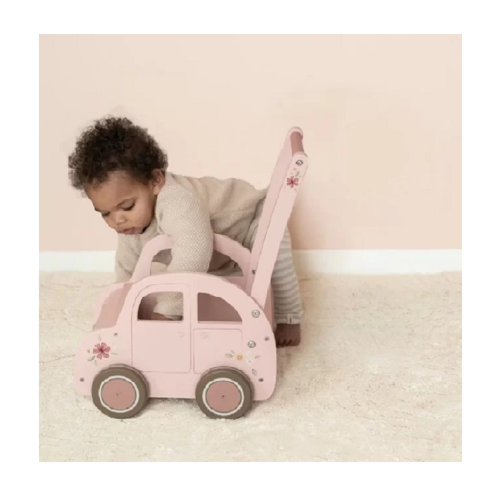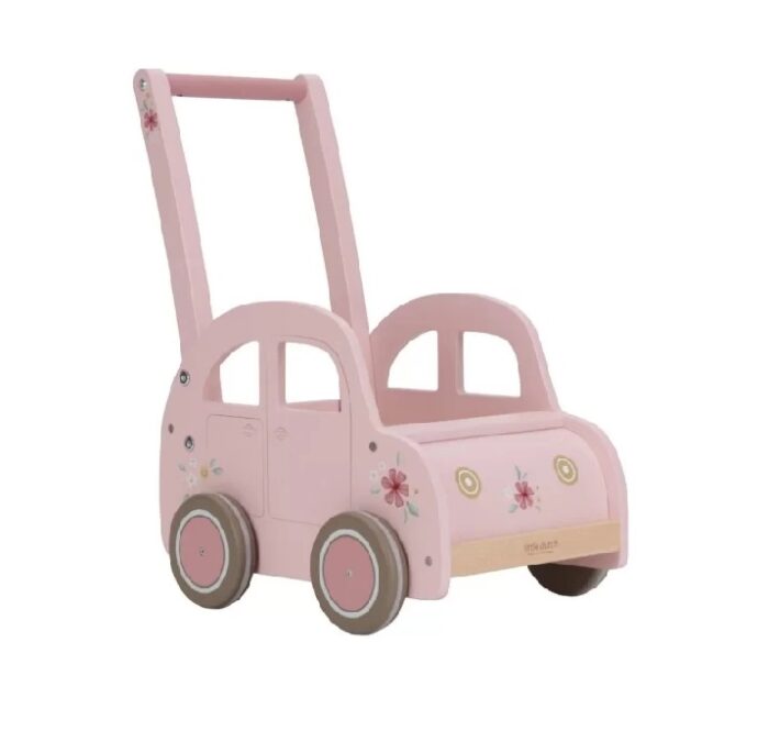 Mališani mogu krenuti u istraživanje dnevne sobe sa ovom roze guralicom. Korak po korak, naučiće da hodaju uz pomoć ove guralice, koja im pruža stabilnost na tom putu. Uz cvetne detalje i vintage šarm, guralica pruža priliku za kreativnu igru, jer mališani mogu zamisliti da su vozači u svom malom vozilu. Drvena roze guralica nije samo praktična za prve korake, već se može koristiti i kao kutija za igračke. Mališani mogu napuniti guralicu omiljenim igračkama i uživati u maštovitoj igri kod kuće, ili je poneti u šetnju.