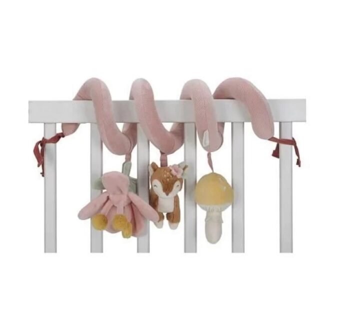 Spiralna igračka je izrađena od somota i pamuka, sa detaljima poput nežne srne, simpatične pečurke i prelepog cveta.