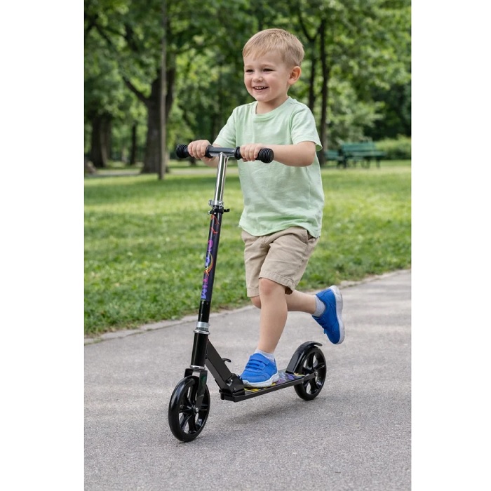 Trotinet teen crni do 50 kg je jednostavan sklopivi dečiji trotinet napravljen za svakodnevnu vožnju po asfaltu, ispred zgrade, u parku i po naselju. Ideja nije da bude komplikovan ili “tehnički impresivan”, nego da ga dete uzme i odmah krene da vozi.